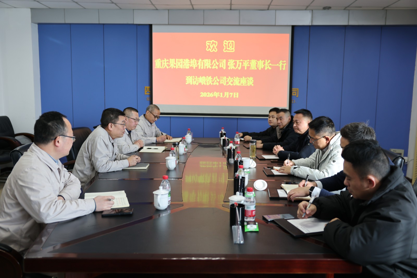 近日,重慶果園港埠有限公司黨委書記、董事長張萬平一行到訪峨鐵公司,峨鐵公司黨委書記、董事長、總經(jīng)理陳新龍參加座談會(huì)。